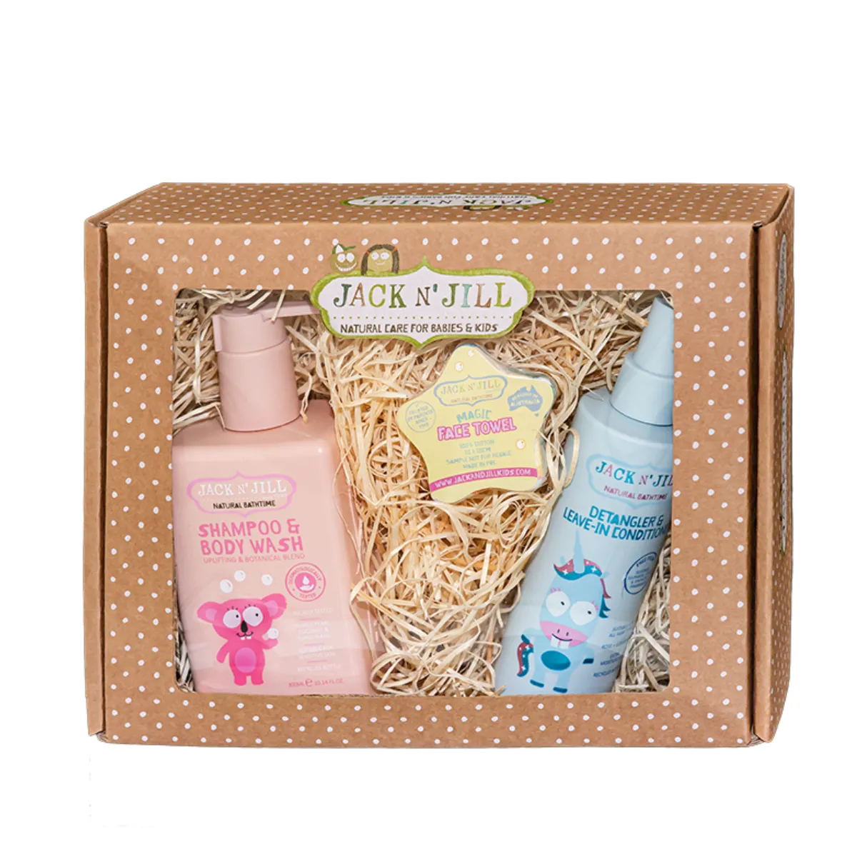 Darčekový set posielame v dizajnovej krabičke s okienkom a dvomi malými darčekmi – magickým uteráčikom a veselou maľovankou so zvieratkami Jack N’Jill.
