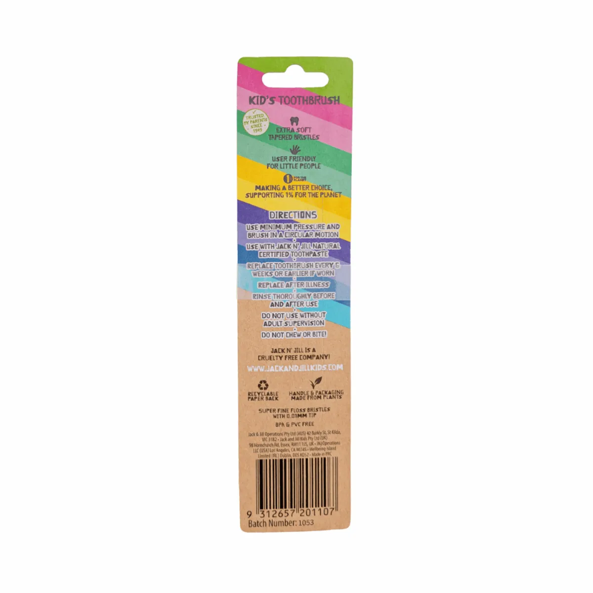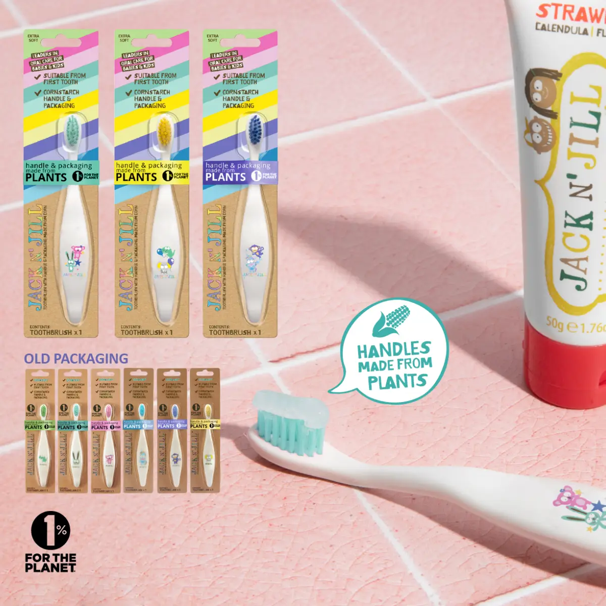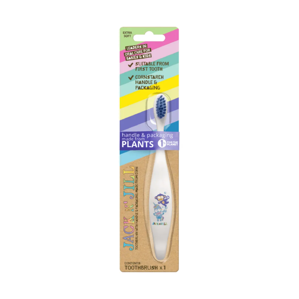 Celé balenie zubnej kefky Jack N’Jill je biologicky rozložiteľné – obal z recyklovaného papiera a okienko zo 100 % kukuričného škrobu.